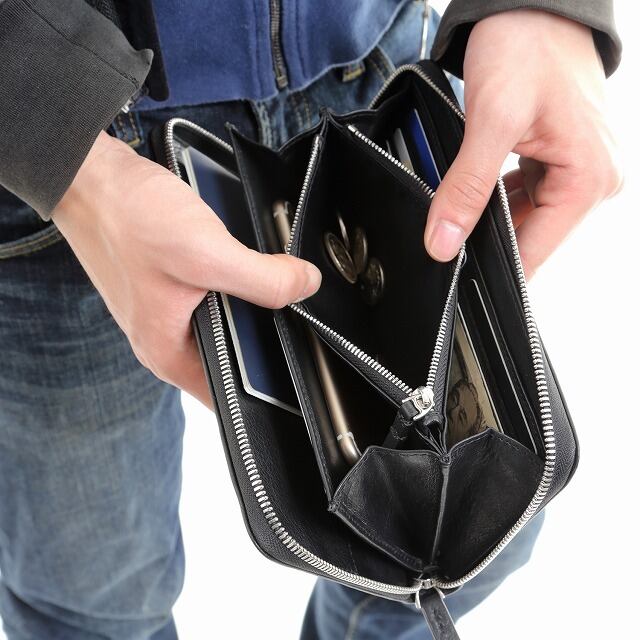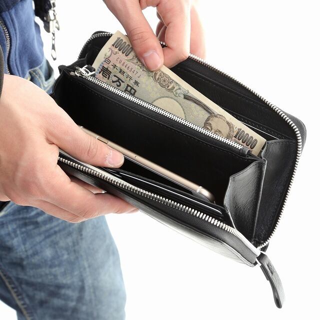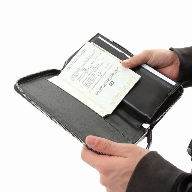 パスポートや通帳、iPhoneなども入る大きめサイズです。